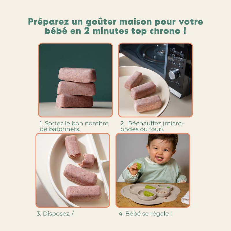 Des ingrédients bio en majorité français. Une cuisson vapeur. Des portions surgelées en forme de bâtonnets à manger à la main pour accompagner bébé à l'autonomie.